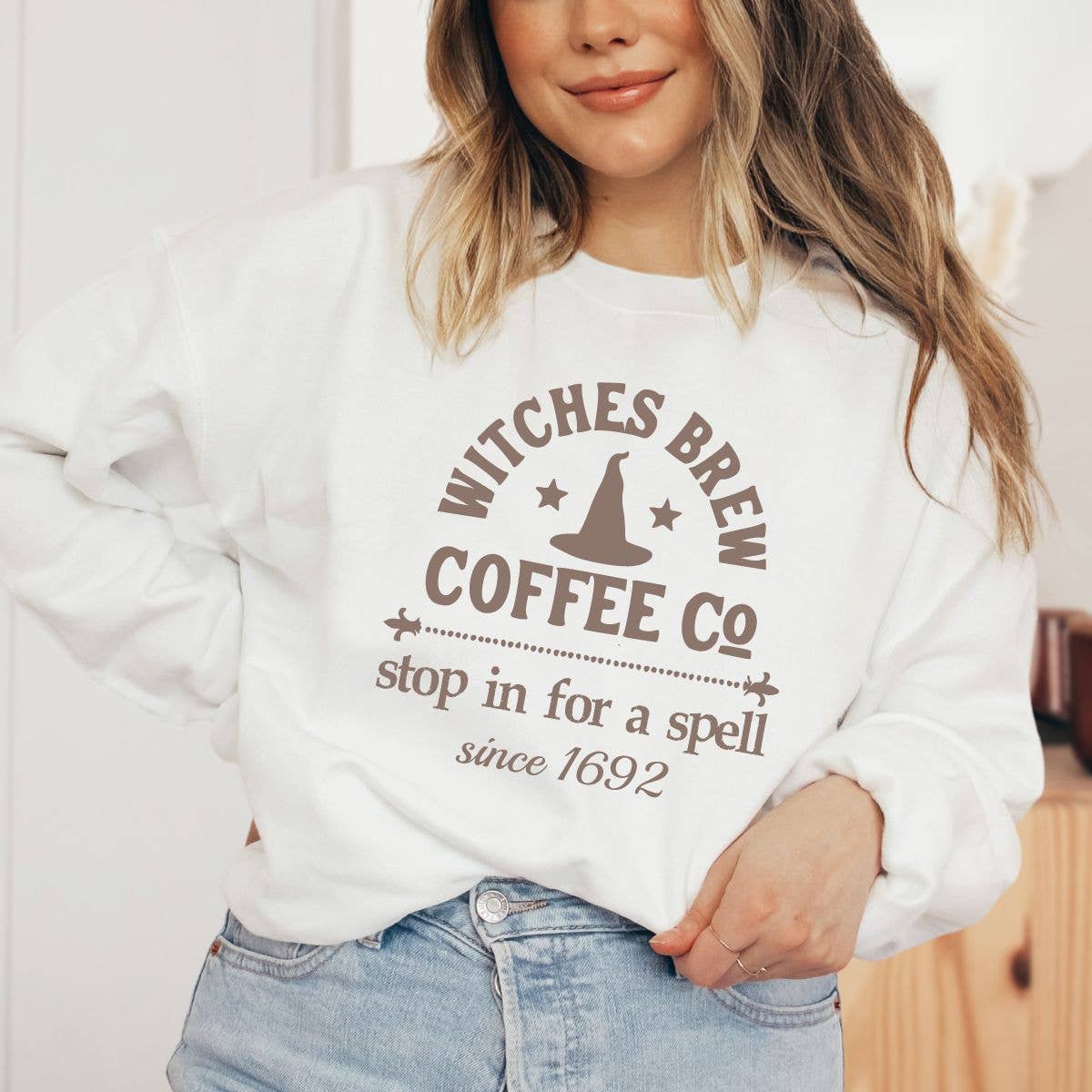 White with brown letters and one small grey with black letters. Witches Brew Crewneck is perfect for spooky season, This sweatshirt is a such a fun look. The material is lightweight and soft - it's so comfortable and buttery soft. * Cotton Blend * Materials may have natural variations * Colors may vary from different viewing devices. Please allow up to 1-3 business days for us to process the order before your order is shipped. To keep your tee looking great I recommend washing inside out with cold or lukewarm water. Tumble dry on low or line dry.